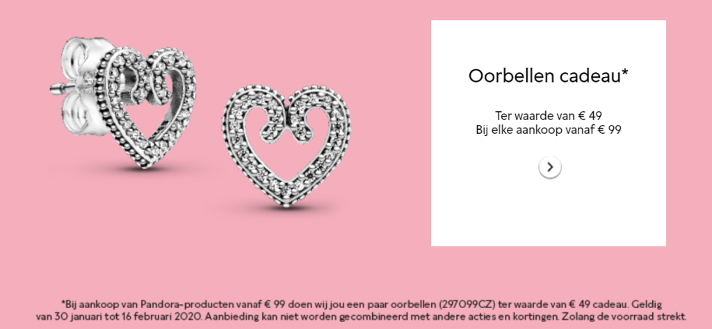 If you spend 99 euros in a Pandora store in Belgium between today and February the sixteenth, they give you a valentine’s gift. A lovely pair of cubic zirconia earrings, worth 49 euros.